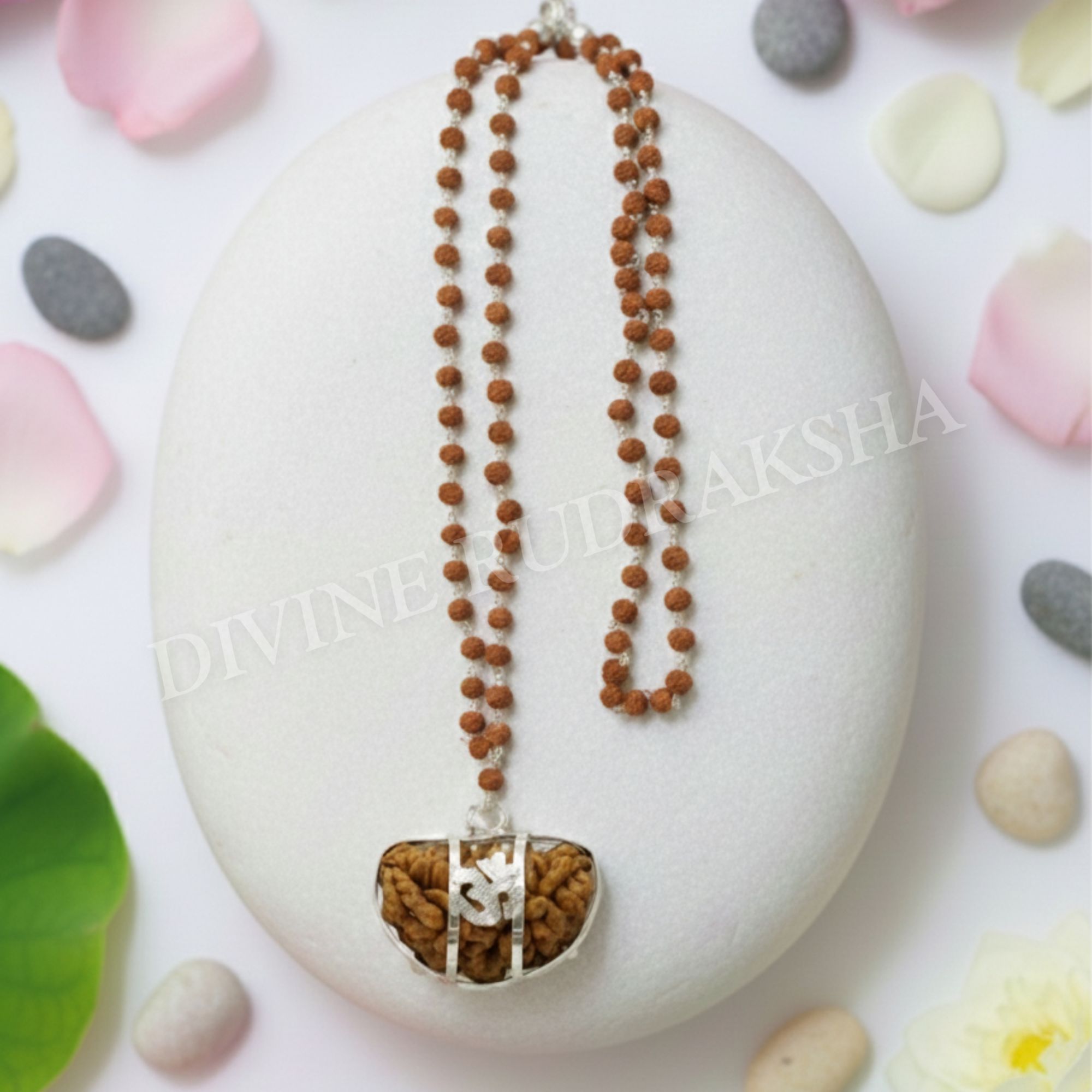 This 1 Mukhi Rudraksha has been encased in Om engraved Silver Pendant and it is attached to a five mukhi Indonesian Rudraksha Mala made from 108+1 beads. The Mala is made in pure silver. The 1 Mukhi Rudraksha along with this Mala looks very elegant and gives an energetic feeling.
