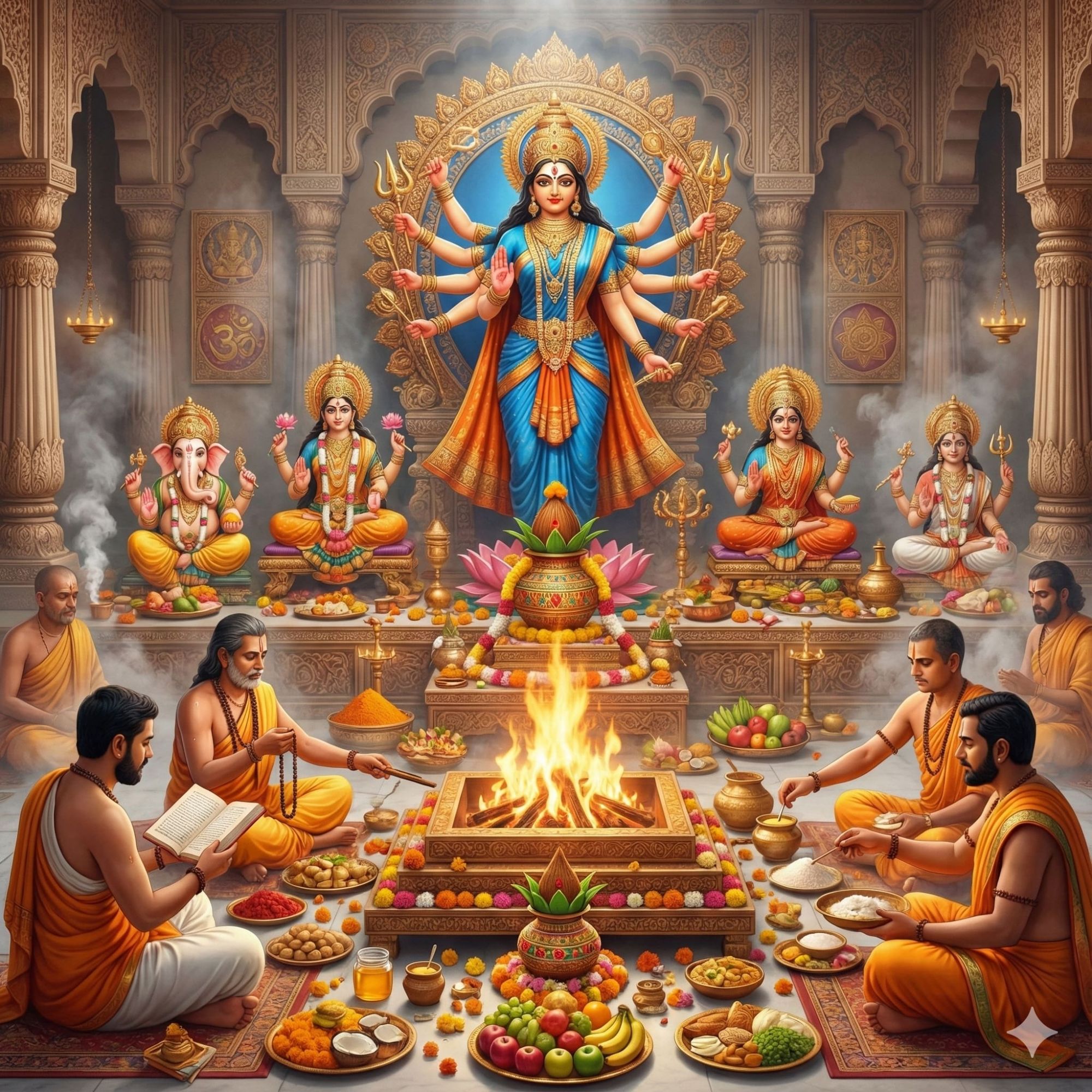 Swasti Vachan, Shanti Path, Sankalp, Ganesh Sthapan, Kalash Sthapan, Durga Sthapan, Brahma Sthapan, Agni Sthapan, Invocation of all Gods and Goddesses, Navgrah Sthapan, Navgrah Mantra Japa (1 mala for each planet), Punyaha Vachan Kalash, Sarvato Bhadra Pujan, Chhetrapal Mandal Pujan, Chatukashti Yogini Pujan, Recitation of Devi Suktam Path, Recitation of Durga Sahastranaam Path, Recitation of Durga Kavach Path, Recitation of Durga Mantra, Durga Yantra Puja, Devi Durga Puja, Homam with Honey, Ghee, Sugar, Til, Ashtagandh, Sandalwood Powder, Navgrah Samidha and then Purnahuti, Aarti and Prasad to Brahmins