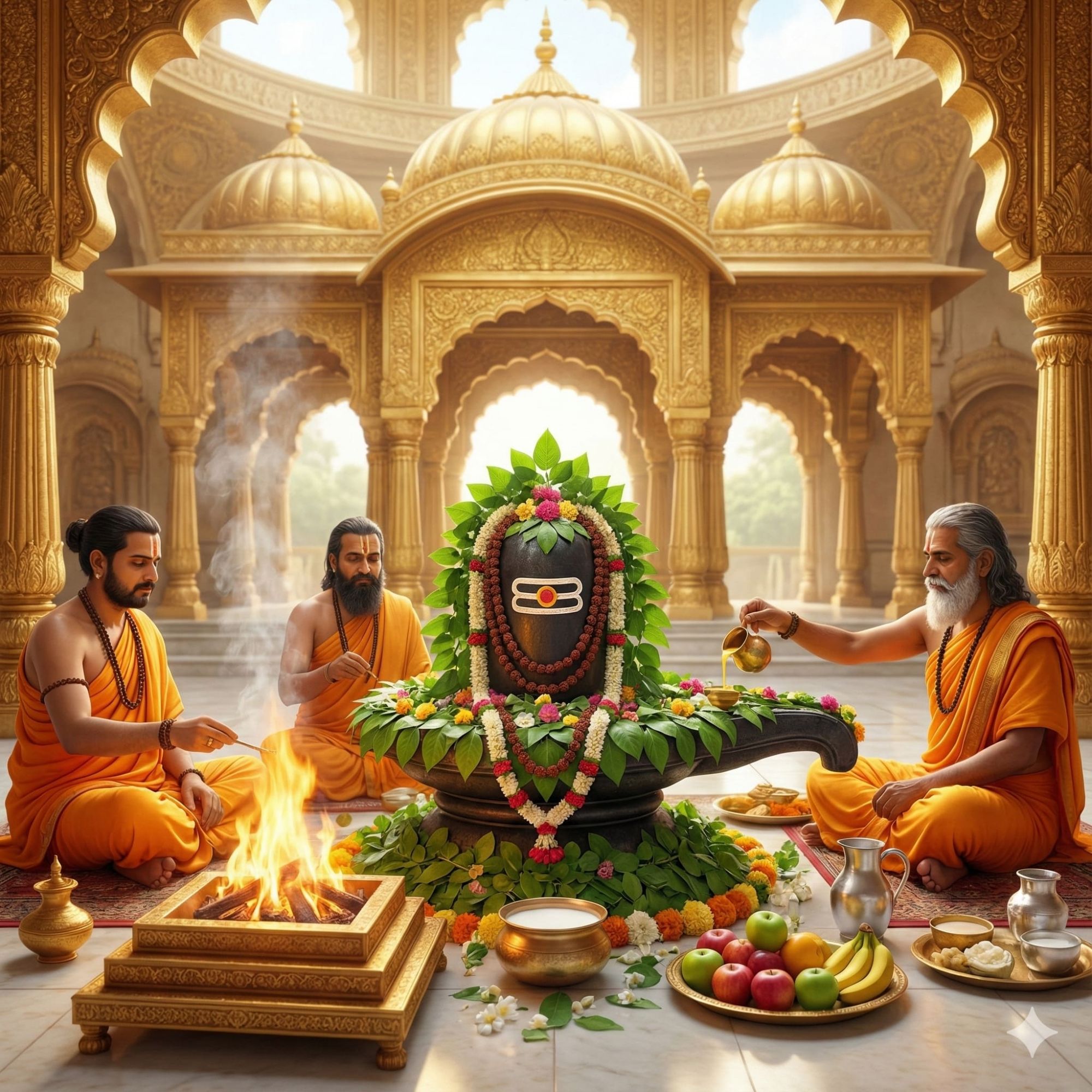 3. 51000 Bilva Patras Archana ( 1700 Bilva Patras everyday ) starting from 1st day of Adhik Shravan month till the Last day of Adhik Shravan month; followed by Homam with Honey, Ghee, Sugar, Til, Oats ( Jow ), Ashtagandh, Sandalwood powder, Navgrah Samidha and then Lord Shiva's Aarti, Prasad to Brahmins on the final day