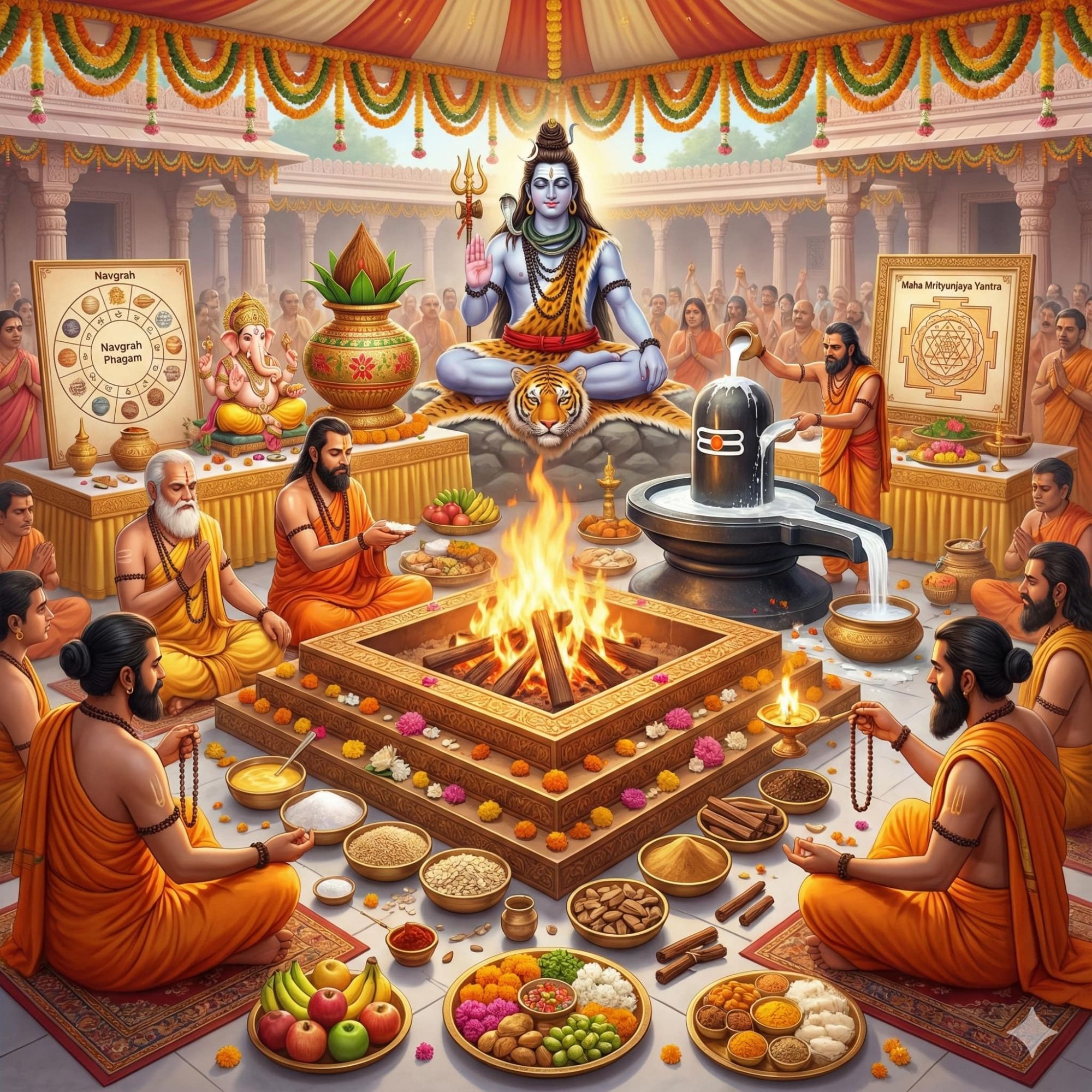 Swasti Vachan, Shanti Path, Sankalp, Ganesh Sthapan, Kalash Sthapan, Lord Shiva Sthapan, Navgrah Sthapan, Brahma Sthapan, Agni Sthapan, Invocation of all Gods & Goddesses, Navgrah Mantra Japa (1 mala for each planet), Shiv Rajopachar Puja, Maha Mrityunjaya Mantra Japa (as per number of Japas), Lord Shiva's Abhishek (Archana), Maha Mrityunjaya Yantra Pujan, Homam with Ghee, Sugar, Til, Oats (Jow), Ashtagandh, Sandalwood powder, Navgrah Samidha and then Purnahuti, Aarti and Prasad to Brahmins.