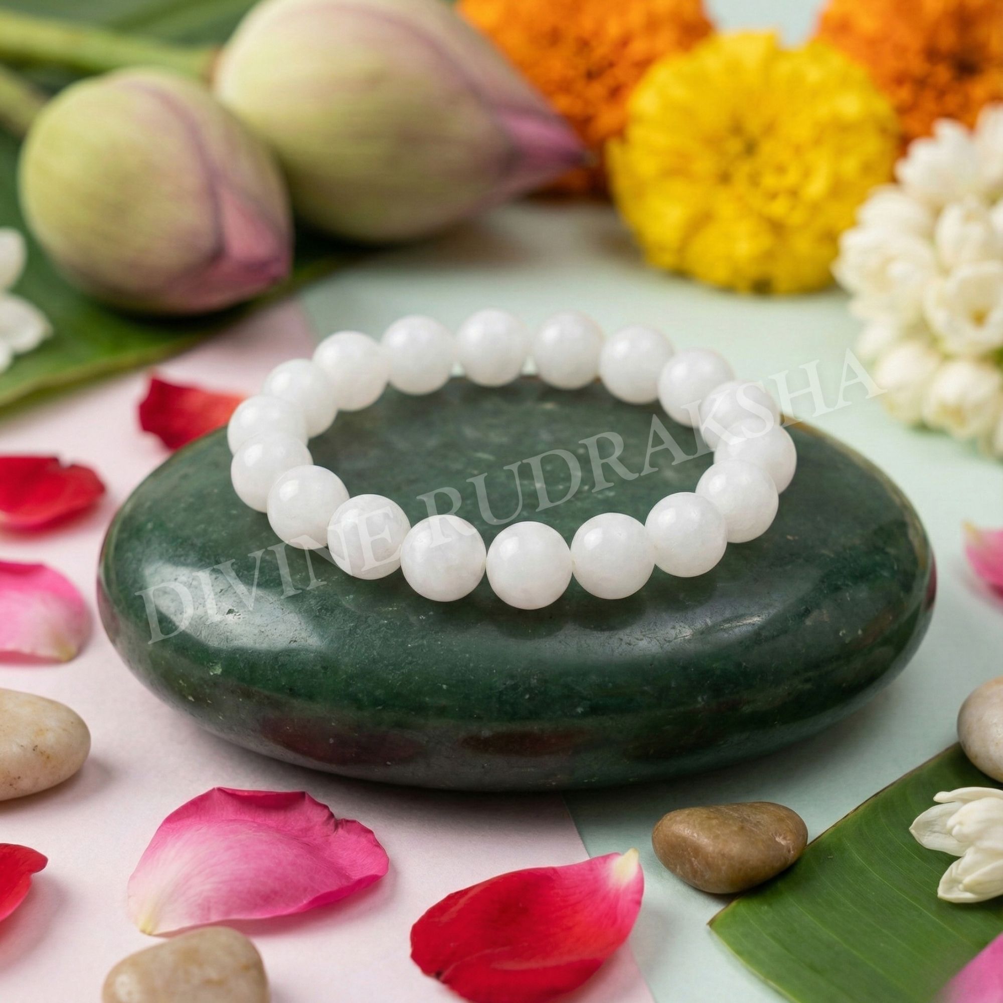 This bracelet is made using round smooth Moon stones, which is a gem that derives its properties from planet Moon (Chandra). This bracelet gives rejuvenated energy to its wearer, as well as believed to be beneficial for attracting someone. Not only this, but according to ancient texts, it also acts as a talisman for travelers.