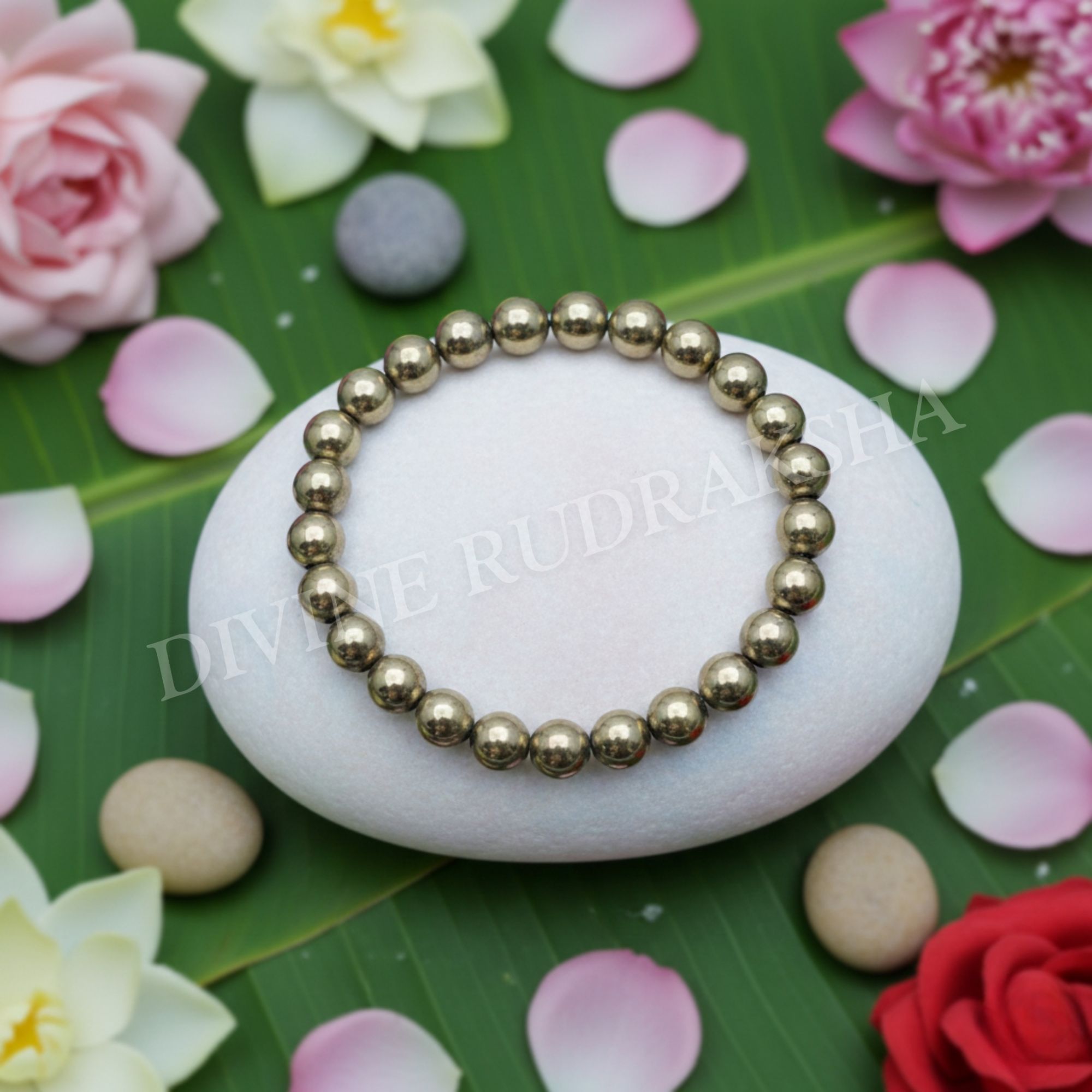 Pyrite is a brassy colored stone that is similar to gold, and because of this resemblance, it is also known as "Fool's Gold". Pyrite is known to attract opportunities in life and used since ancient times to attract business luck. Traders used to carry pyrite with them for business dealings. Pyrite stone bracelet is a metal based stone bracelet and therefore gives the wearer the strength to face the world. It can also be used to overcome shyness and fear. Pyrite gives good results in strengthening the self-confidence. Moreover, Pyrite is a protective stone that wants to shield and protect its wearer in every way possible. Whether it is emotional vamps or psychic attacks, cutting through negative vibrations, clearing electro magnetic fields haze or simply stopping the toxic thought patterns from running through the mind, Pyrite stone bracelet is ever eager to keep one pure. Pyrite also promotes good physical health and emotional well-being.