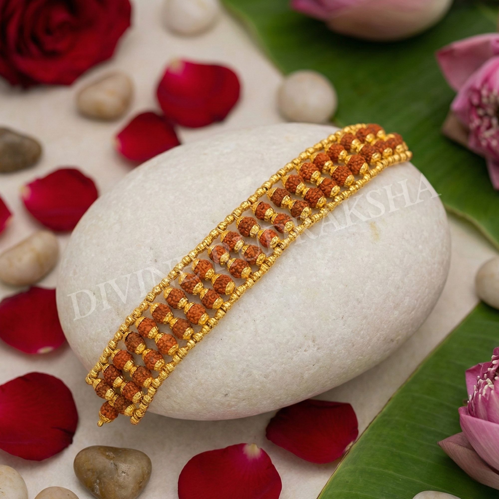 This bracelet contains 5 mukhi Indonesian Rudraksha beads capped with Golden metal caps in Double line which looks very beautiful.