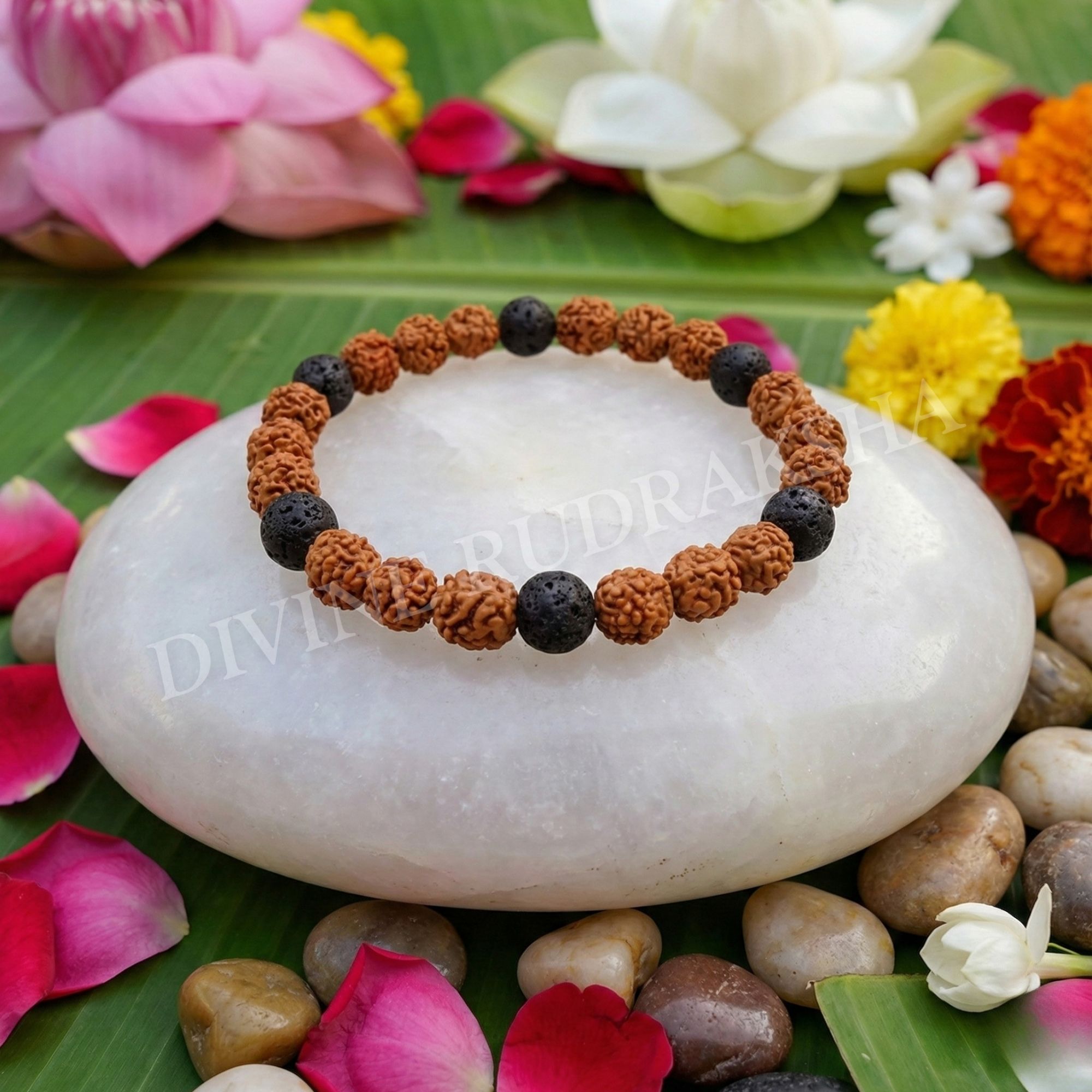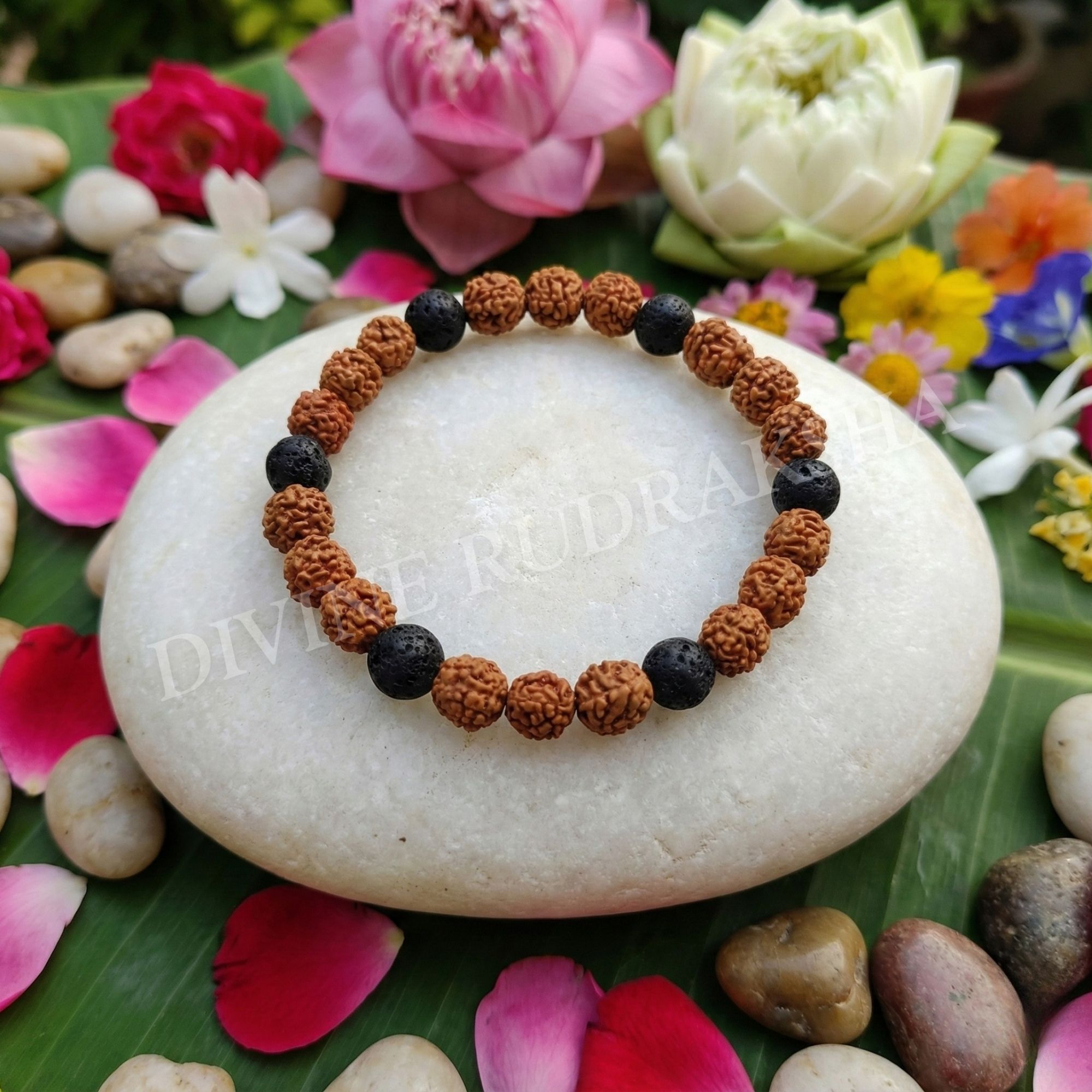 This Bracelet is made up using 5 Mukhi Indonesian Rudrakshas and Lava stones, strung in stretchable elastic.