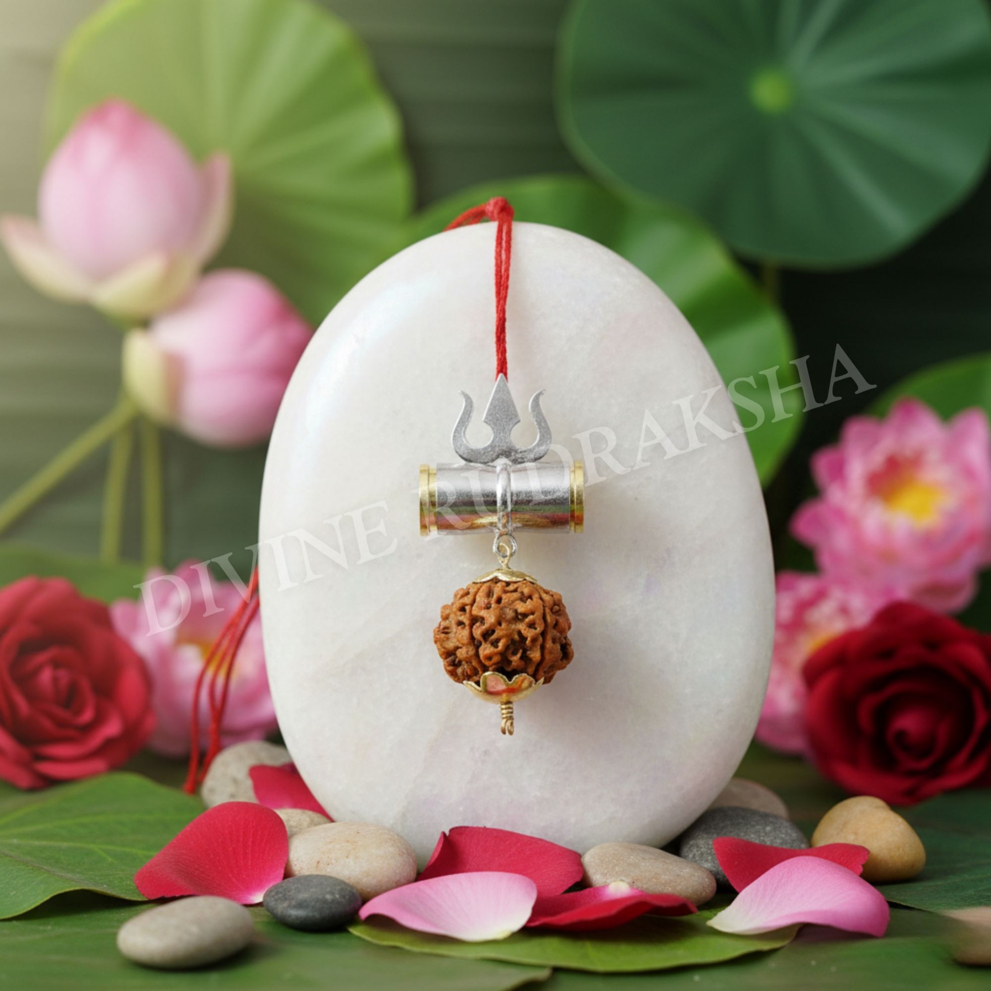 Shiva Rudraksha Kavach holds three fold powers of Lord Shiva. It has a Trishul, a Damroo and a 5 mukhi Rudraksha ( All favourite to Lord Shiva ). Lord Shiva uses Trishul when he gets angry, to destroy the evils from the Earth. He plays Damroo ( a musical instrument ) when he is happy which fills the surroundings with positive energy.