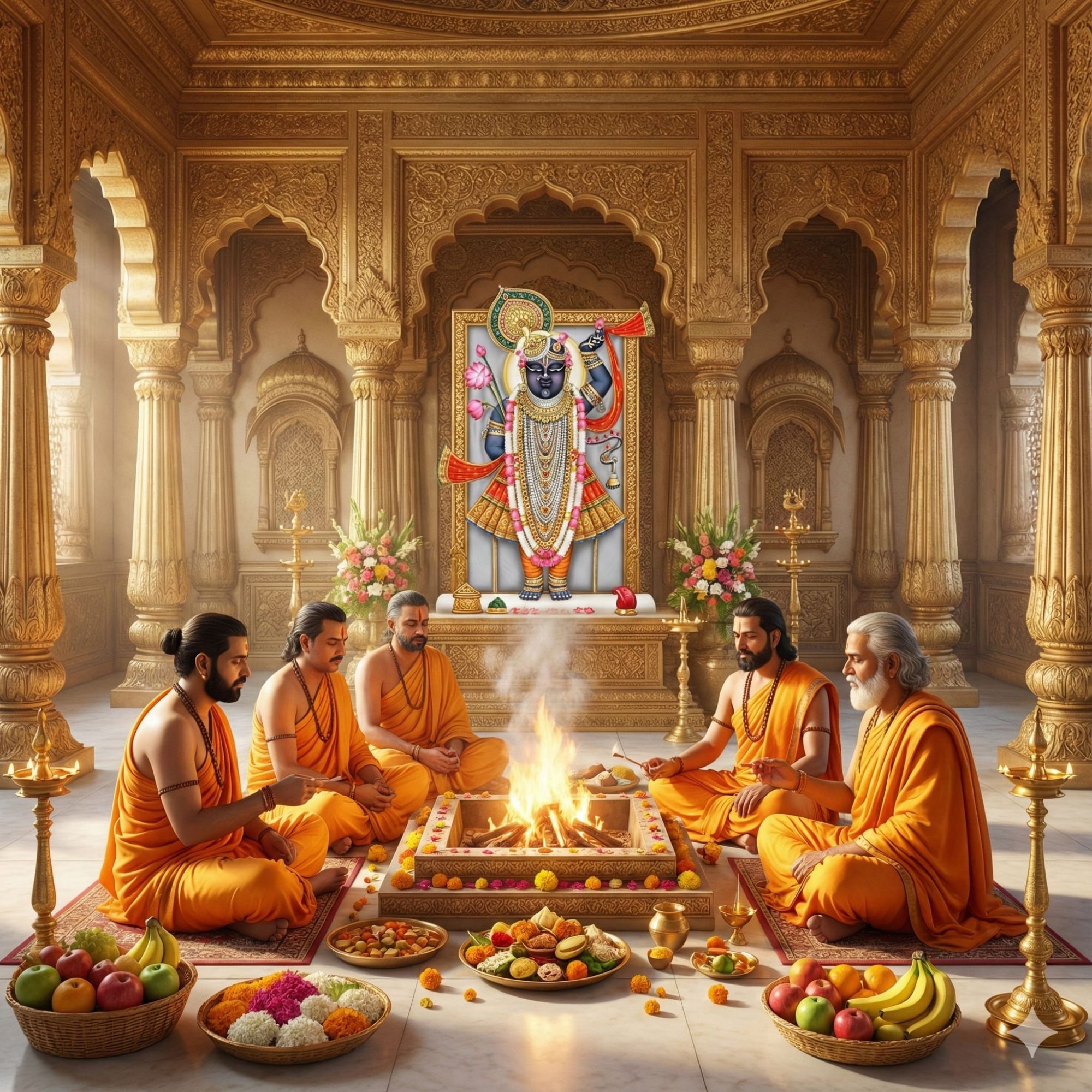 Swasti Vachan, Shanti Path, Sankalp, Ganesh Sthapan, Kalash Sthapan, Lakshmi Sthapan, Lord Shreenath ji Sthapna, Navgrah Sthapan, Brahma Sthapan, Agni Sthapan, Invocation of all Gods and Goddesses, Navgrah Mantra Japa (1 mala for each planet), Mantra Japa for Shreenathji, Krishna Yantra Puja, Offerings to Lord Shreenath ji, Shreenath ji Puja, Homam with Honey, Ghee, Sugar, Til, Ashtagandh, Sandalwood powder, Navgrah Samidha and then Purnahuti, Aarti and Prasad to Brahmin