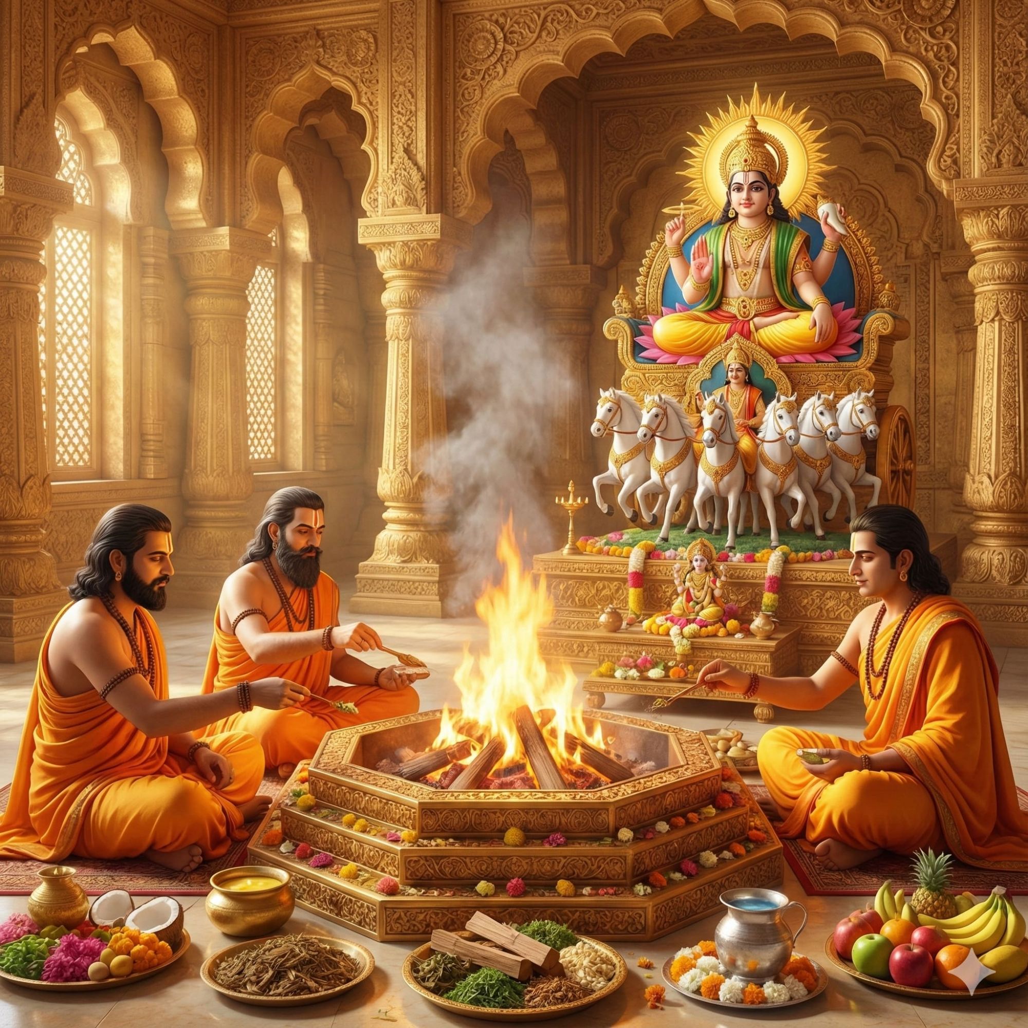 Swasti Vachan, Shanti Path, Sankalp, Ganesh Sthapan, Kalash Sthapan, Lakshmi Sthapan, Surya Dev Sthapan, Navgrah Sthapan, Brahma Sthapan, Agni Sthapan, Invocation of all Gods and Goddesses, Navgrah Mantra Japa (1 mala for each planet), Surya Mantra Japa, Surya Yantra Puja, Lord Shiva Puja, Lord Vishnu Puja, Surya Homam with Honey, Ghee, Sugar, Til, Ashtagandh, Sandalwood powder, Navgrah Samidha and then Purnahuti, Aarti, Offerings for Surya Shanti and Prasad to Brahmins.