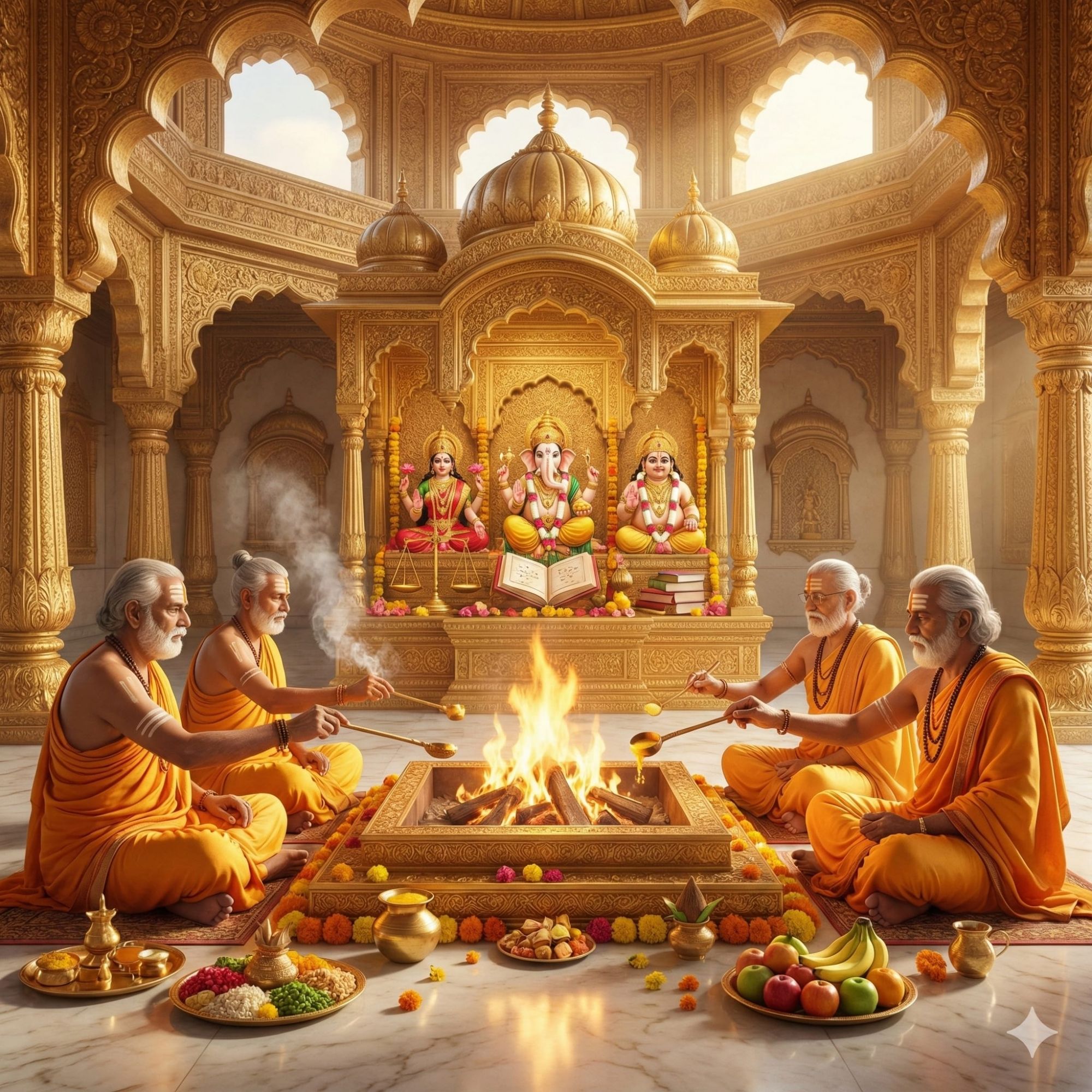 Swasti Vachan, Shanti Path, Sankalp, Ganesh Sthapan, Kalash Sthapan, Lakshmi Sthapan, Lord Kuber Sthapan, Kanakdhara Devi Sthapan, Saraswati Devi Sthapan, Bagulamukhi Devi Sthapan, Vaastu Dev Sthapan, Navgrah Sthapan, Brahma Sthapan, Agni Sthapan, Invocation of all Gods and Goddesses, Navgrah Mantra Japa (1 mala for each planet), Recitation of Ganesha, Maha Lakshmi, Kuber, Kanakdhara, Saraswati, Baglamukhi and Vaastu Purush Mantras, Puja of Lord Ganesh, Goddess Lakshmi, Lord Kuber, Goddess Kanakdhara, Goddess Baglamukhi and Vastu Dev, Homam with Honey, Ghee, Sugar, Til, Ashtagandh, Sandalwood powder, Navgrah Samidha and then Purnahuti, Aarti, Prasad to Brahmins